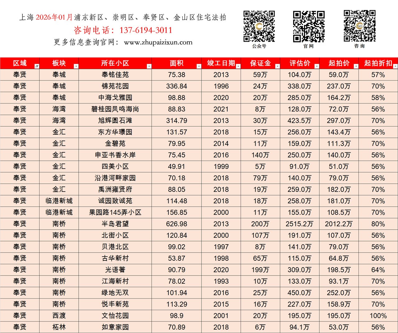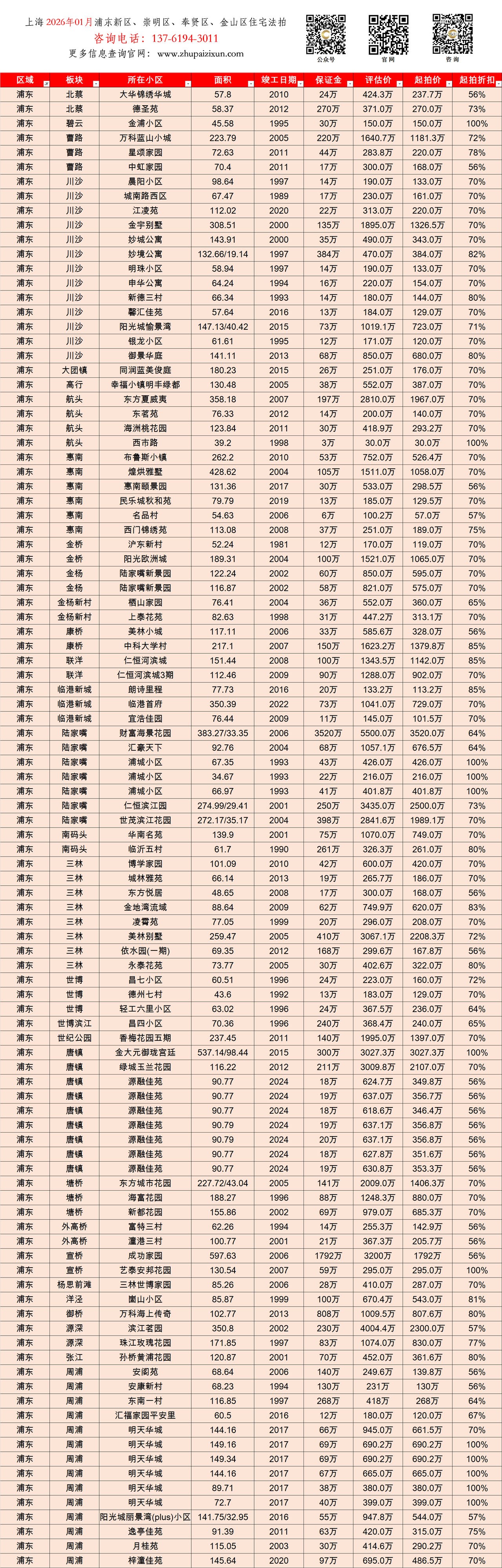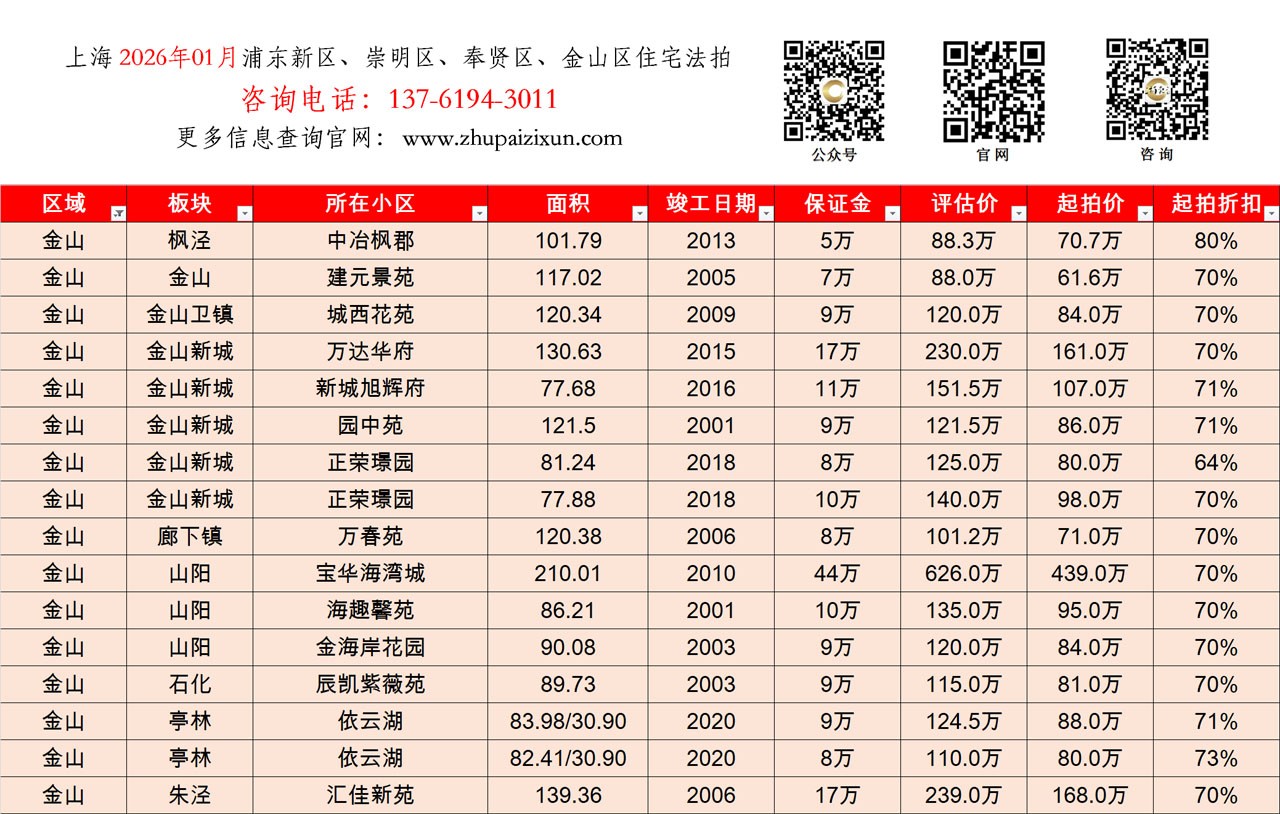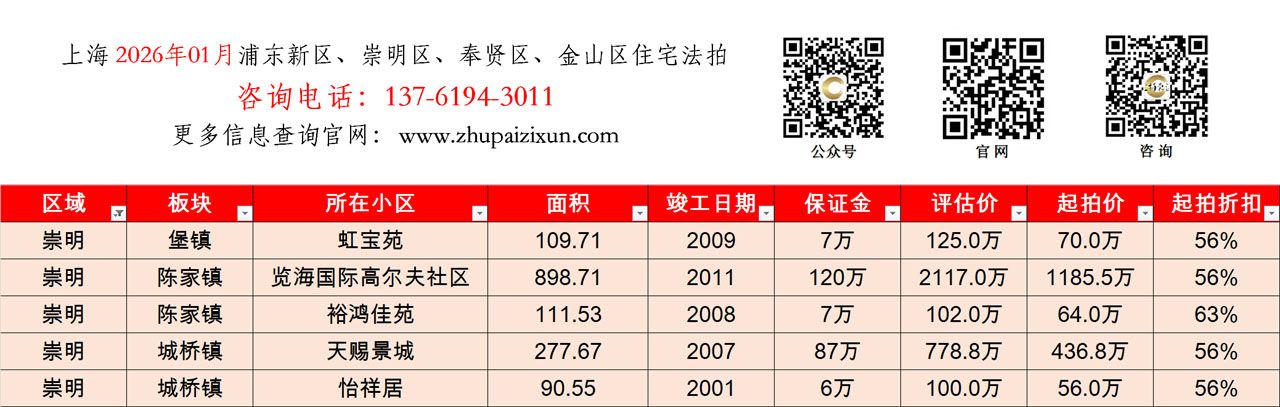 上海市 2026年01月 住宅法拍 上市房源(浦东新区、崇明、奉贤、金山)