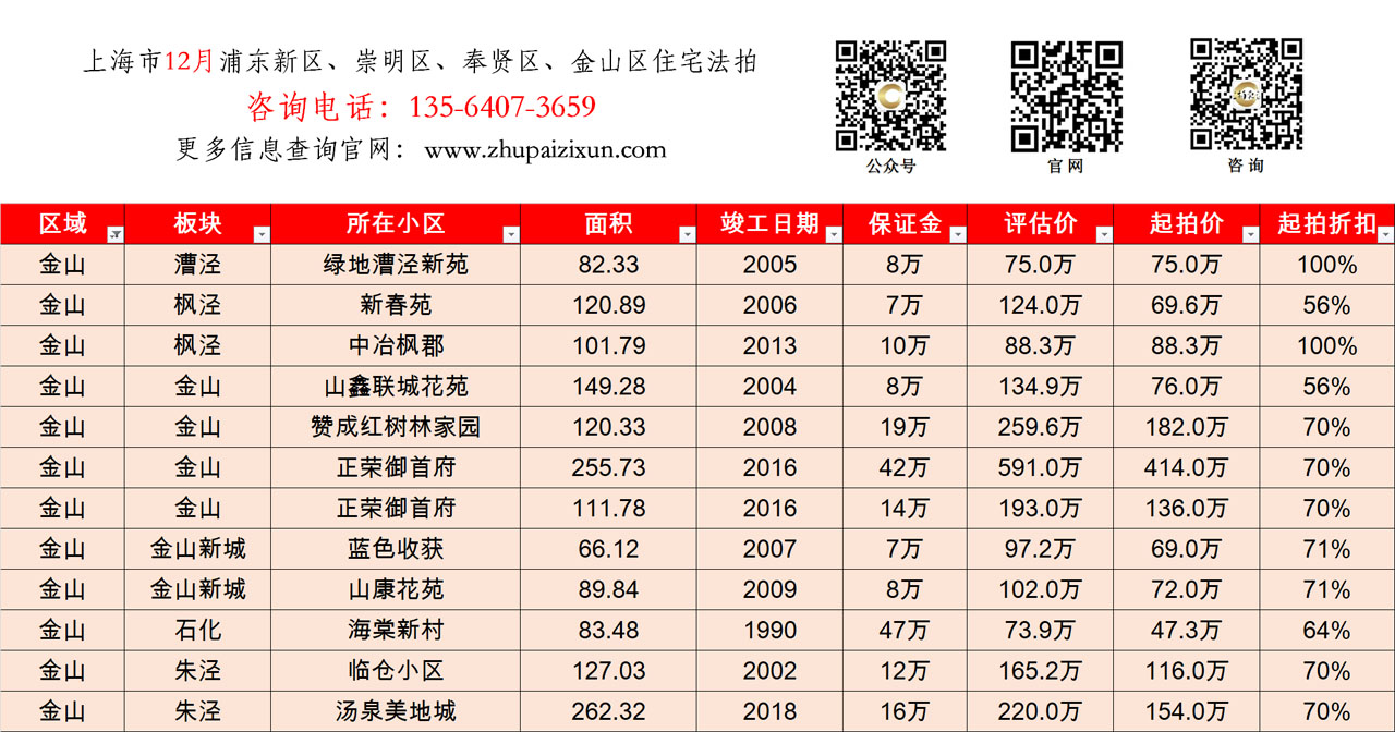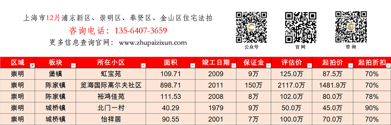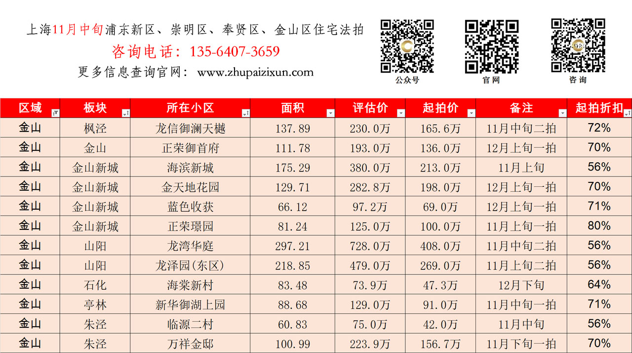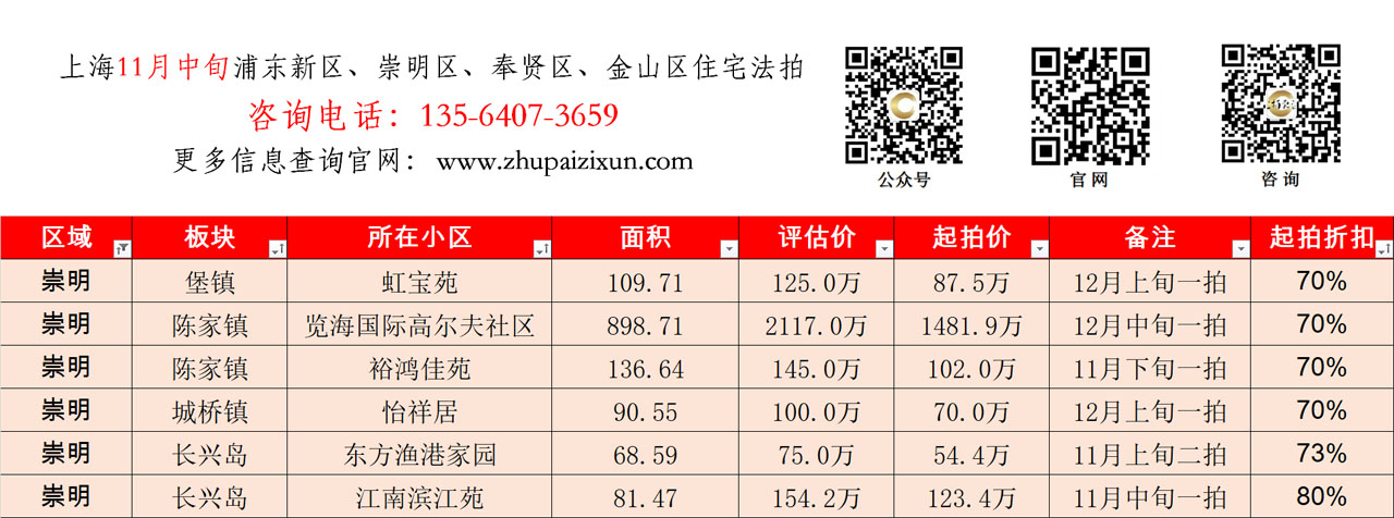 上海市 2025年11月中旬 法拍房 上市房源(浦东新区、崇明、奉贤、金山)