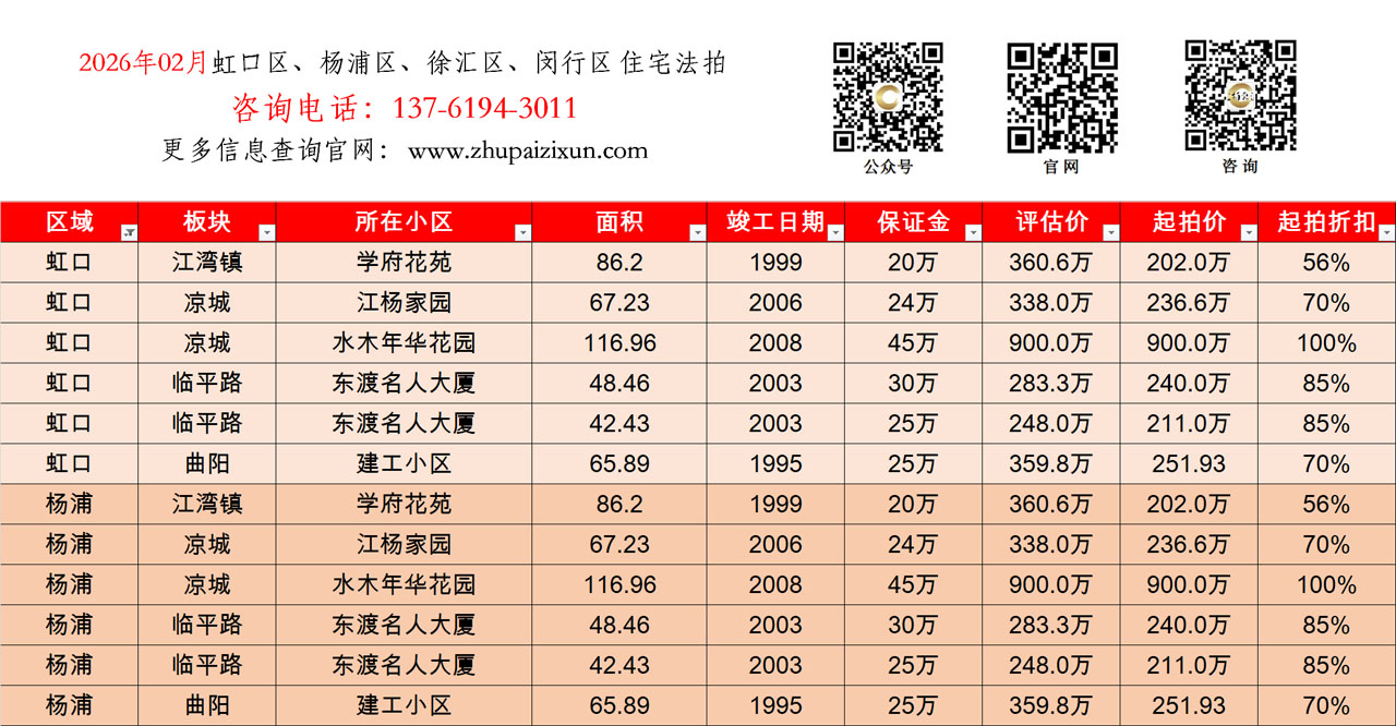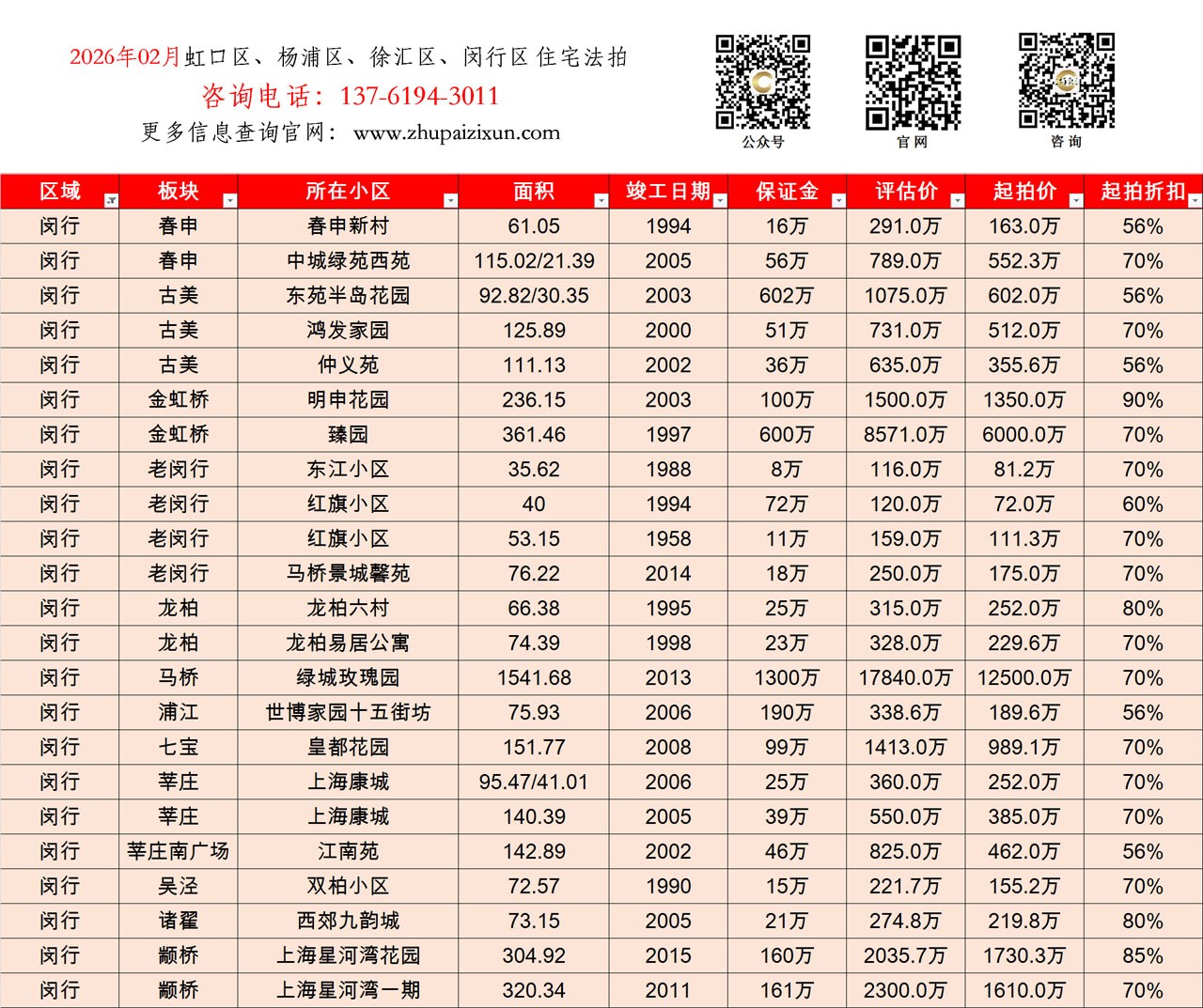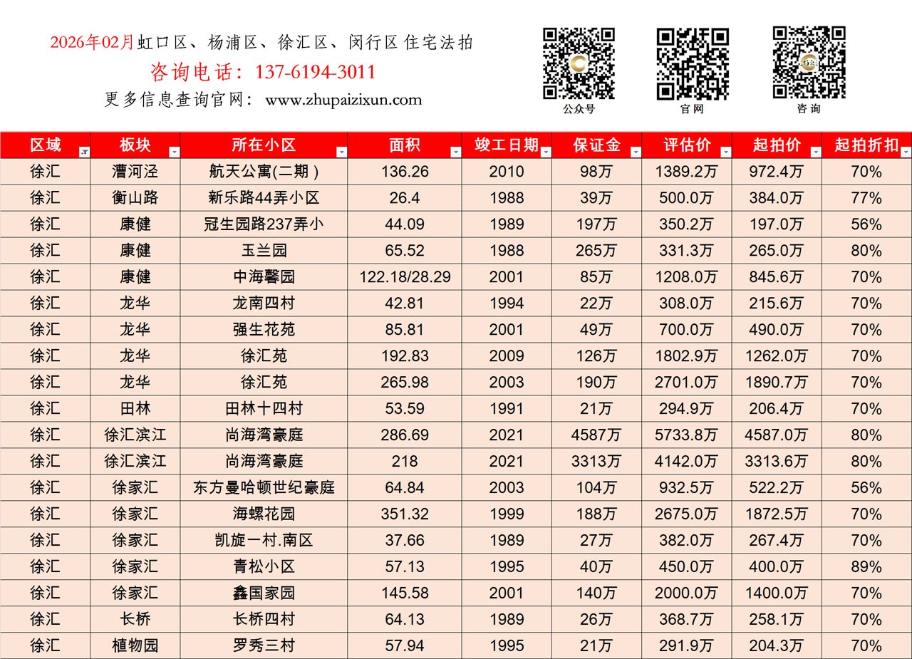 上海市 2026年02月 法拍房 上市房源(徐汇、闵行、虹口、杨浦)