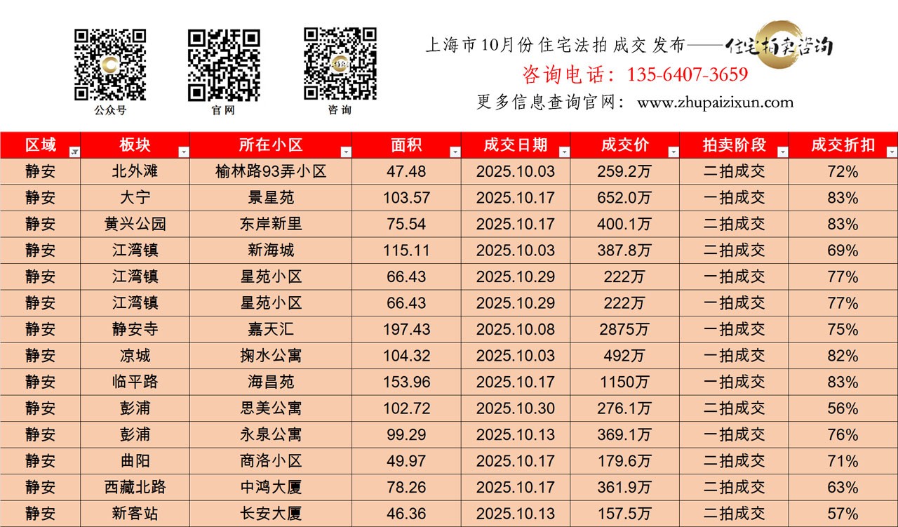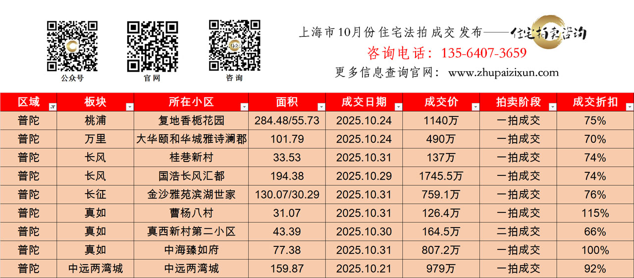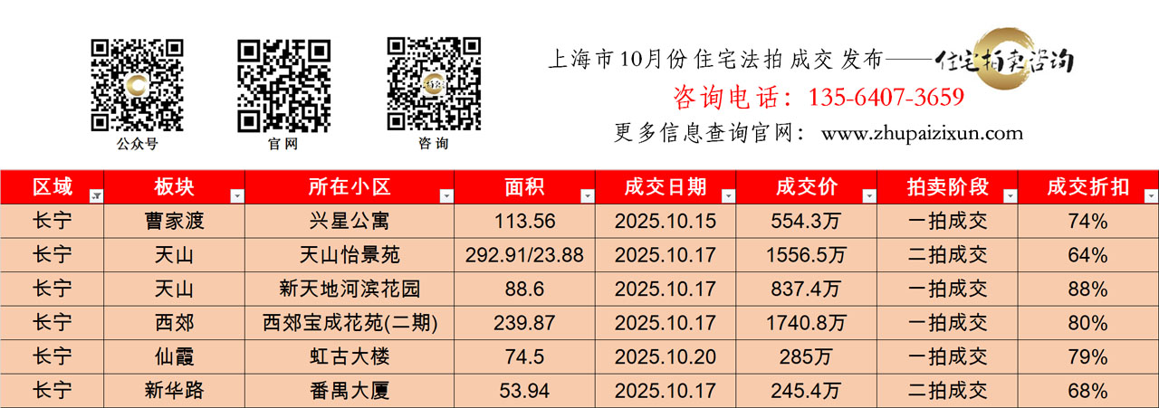 上海市 2025年10月 住宅法拍 上市房源(长宁、普陀、静