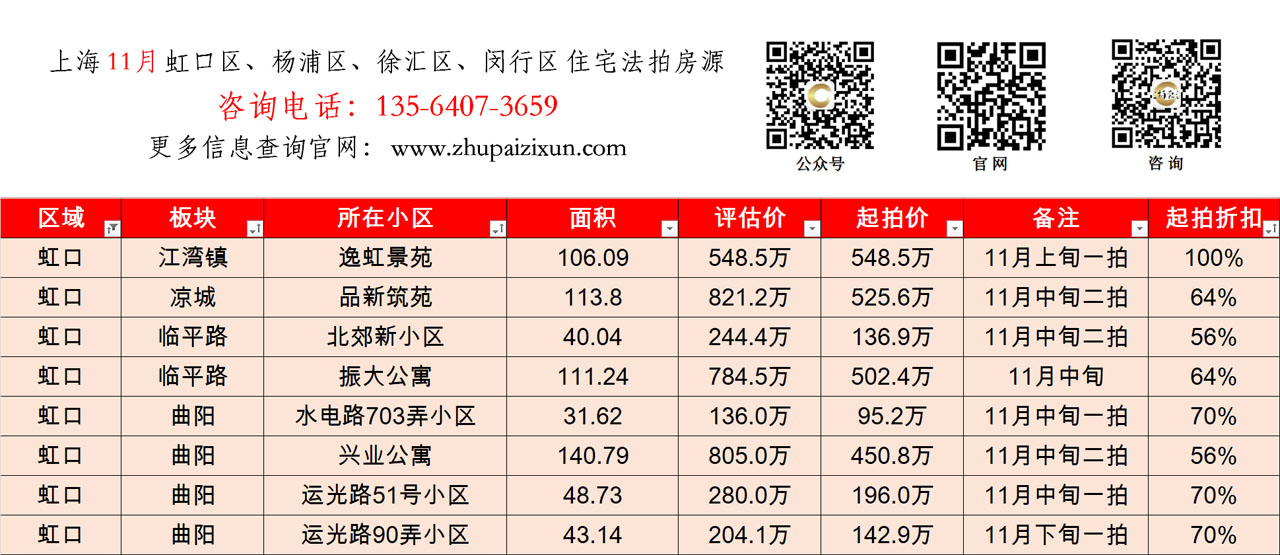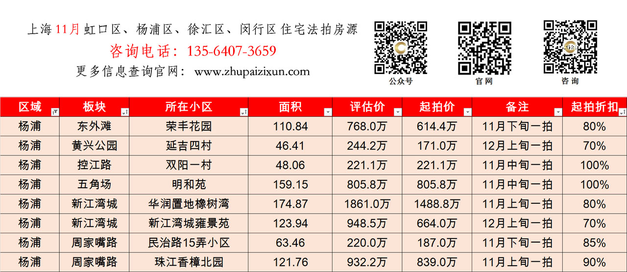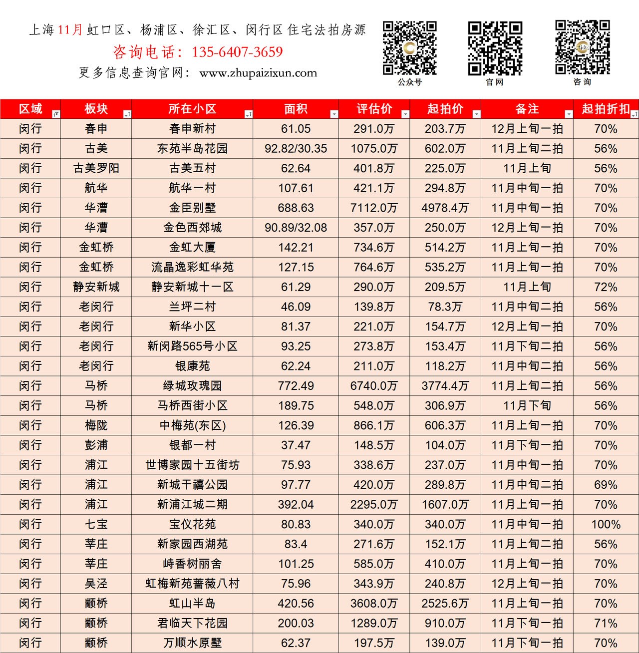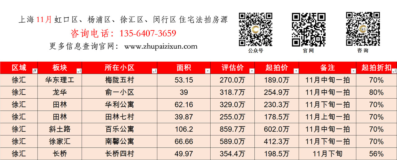 上海市 2025年11月 法拍房 上市房源(徐汇、闵行、虹口、杨浦)